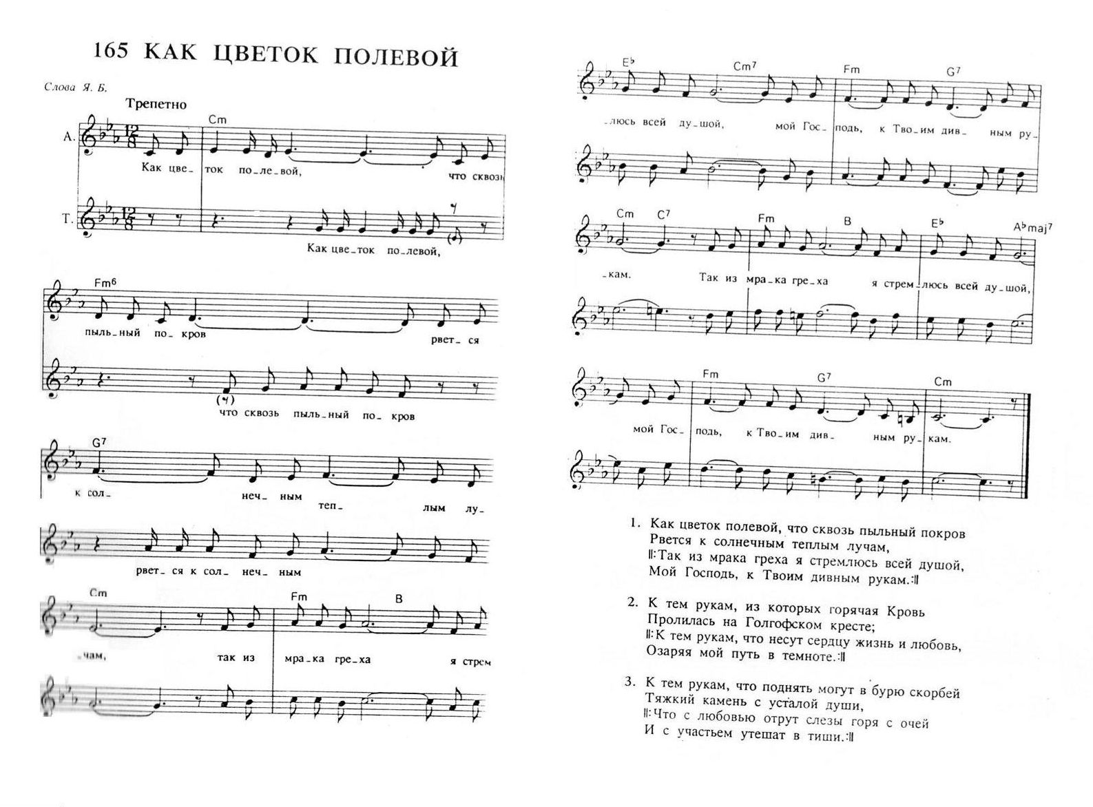 1. Как цветок полевой, Что сквозь пыльный покров Рвётся к солнечным тёплым лучам, // Так из мрака греха Я стремлюсь, свей душой, Мой Господь, к Твоим дивным рукам.//